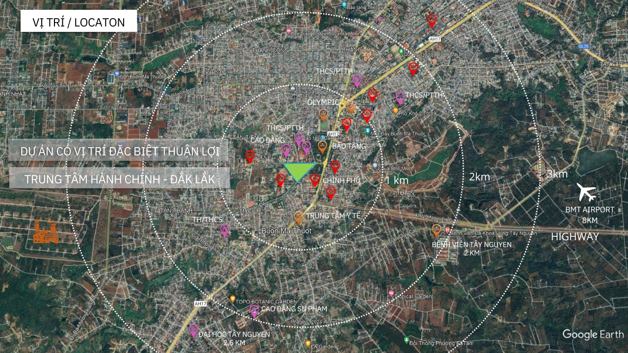Eco Palace sở hữu một vị trí đắc địa ngay trung tâm thành phố Buôn Ma Thuột, Đắk Lắk, tại phường Tân Thành. Dự án nằm gần các tuyến đường chính như Mai Hắc Đế, là cửa ngõ giao thông quan trọng nối liền các khu vực trong thành phố và kết nối với các tỉnh Tây Nguyên. Vị trí này không chỉ thuận tiện cho việc di chuyển mà còn dễ dàng tiếp cận các dịch vụ, tiện ích công cộng và các khu vực trung tâm hành chính, thương mại.